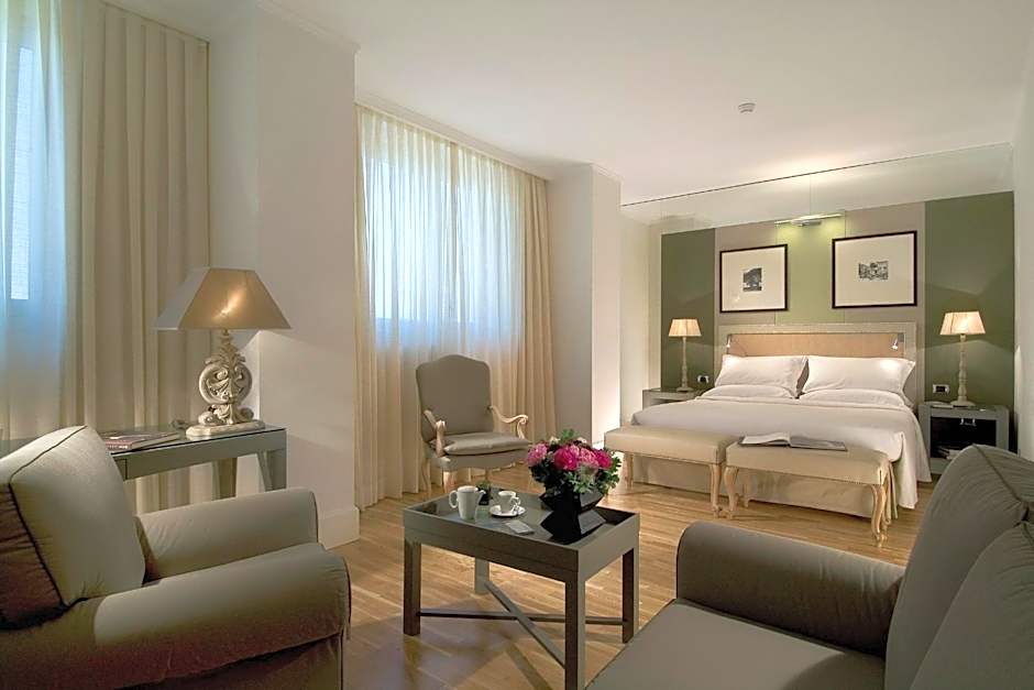 Bright room with light color tones and classic décor. It features a marble bathroom with a shower. It also has free Wi-Fi, a mini-bar and a satellite TV.